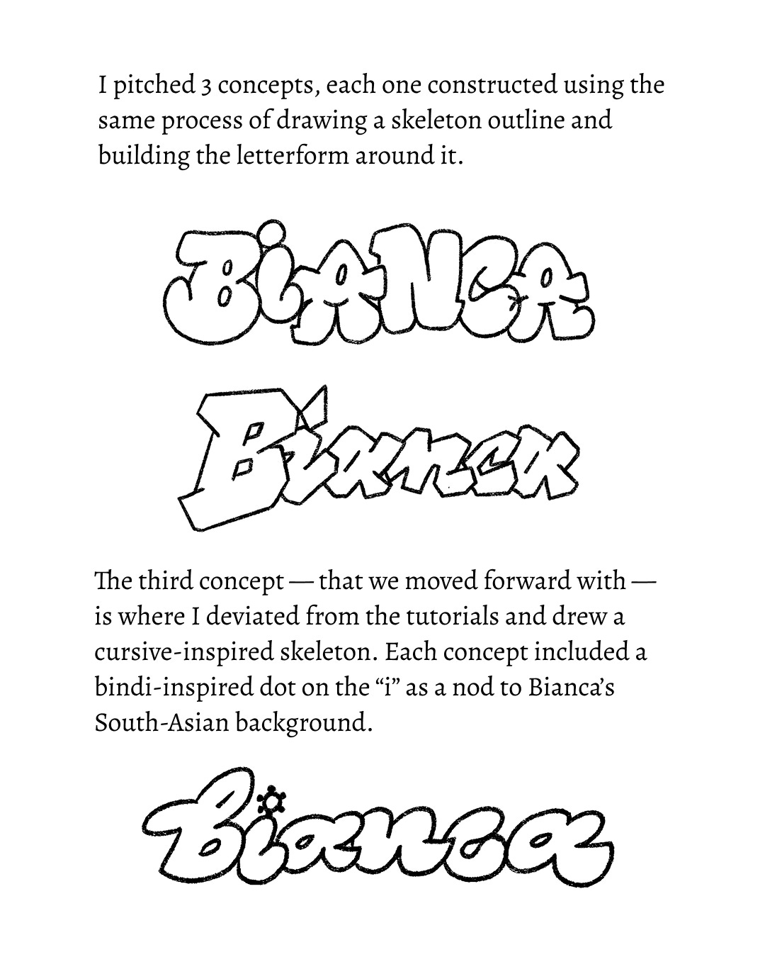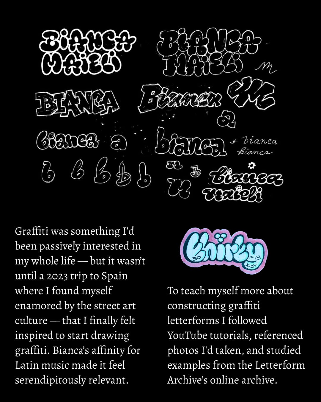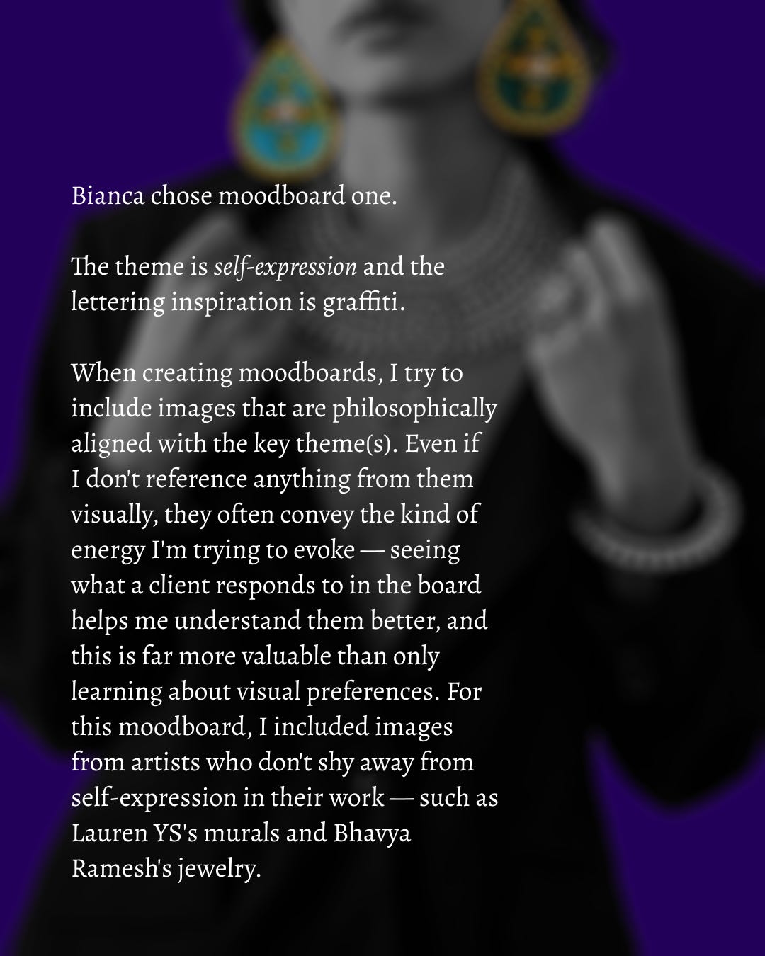 A zine-esque newsletter where I talk about my moodboarding process and designing Bianca's graffiti-inspired logo.